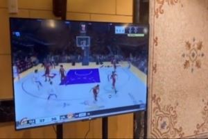 男篮亚洲杯开打前各队在酒店大厅放松 张宁用约基奇角色打2K😁