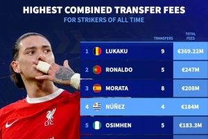 前锋累计转会费排名:卢卡库居首,C罗、莫拉塔、努涅斯前四