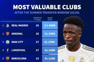 关窗后球队身价排名:皇马14亿欧居首,枪手、曼城前三&曼联第10