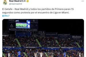 体育资讯10月20日讯 西甲第9轮,皇马客战赫塔费,两队球员开场暂停15秒以抗议西甲海外赛,皇马也在社媒和官网发文。