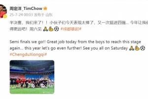 周定洋在个人微博中写道:半决赛,我们来了!!小伙子们今天表现太棒了,又一次挺进四强… 今年让我们走得更远吧!周六见 ⚽️