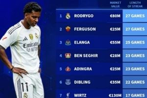 德转盘点目前遭遇进球荒攻击手:罗德里戈27场居首,维尔茨17场