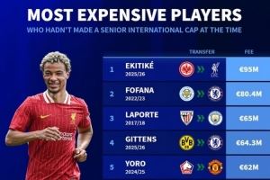 体育资讯7月28日讯 利物浦在上周已经官宣以9500万欧元签下埃基蒂克,而他至今尚未为法国队出战。《转会市场》也统计了那些在加盟时仍未能为成年国家队出场的历史最贵引援。